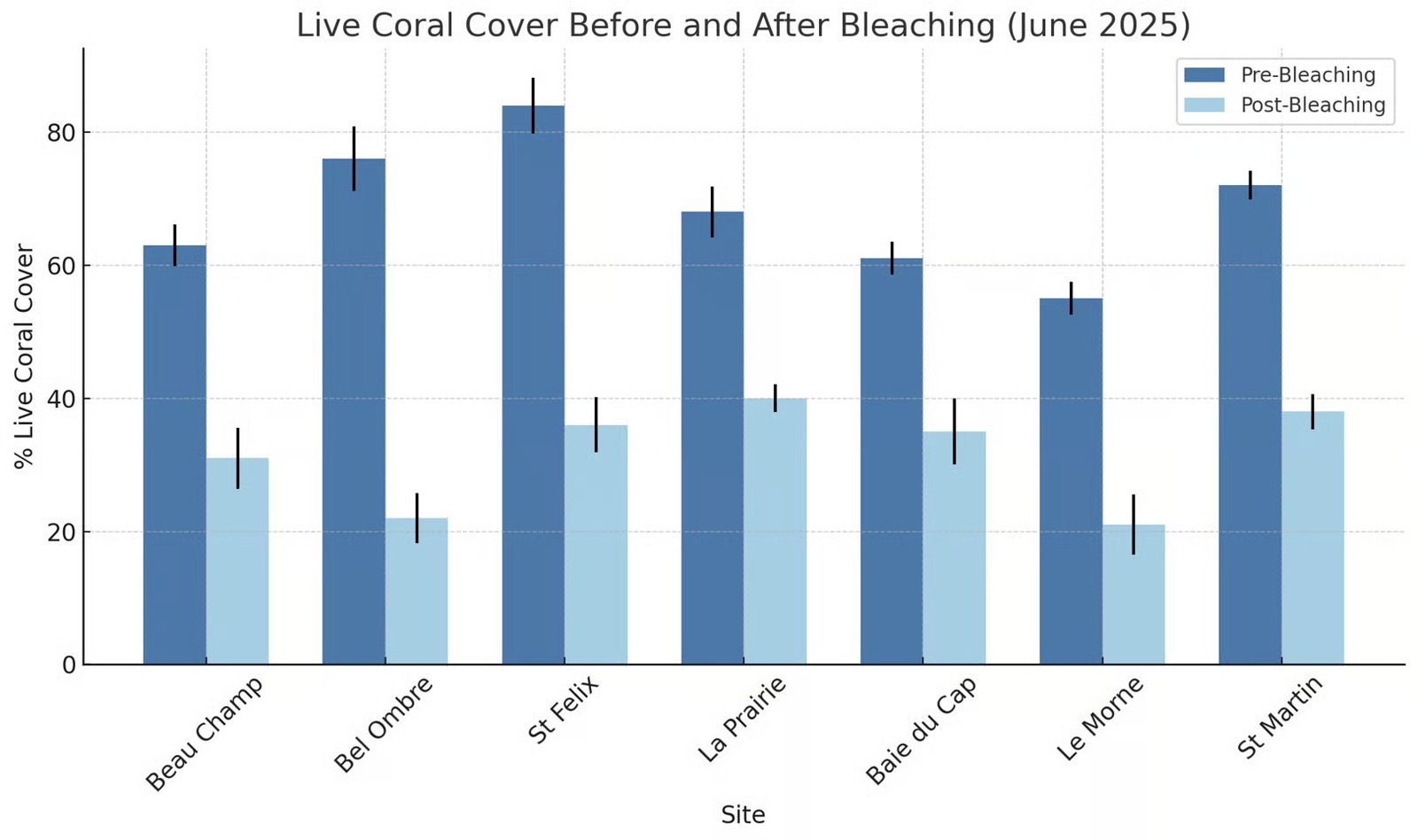 In June 2025, as sea temperatures finally began to cool (<27°C), we returned to our monitoring sites with cautious optimism, hopeful that the corals, once bleached by the unprecedented heatwave, might have begun their path to recovery. Equipped with datasheets, underwater cameras, and a quiet sense of anticipation, our team revisited key stations across Le Morne, La Prairie, Bel Ombre, Beau Champ, St Martin, and St Félix.