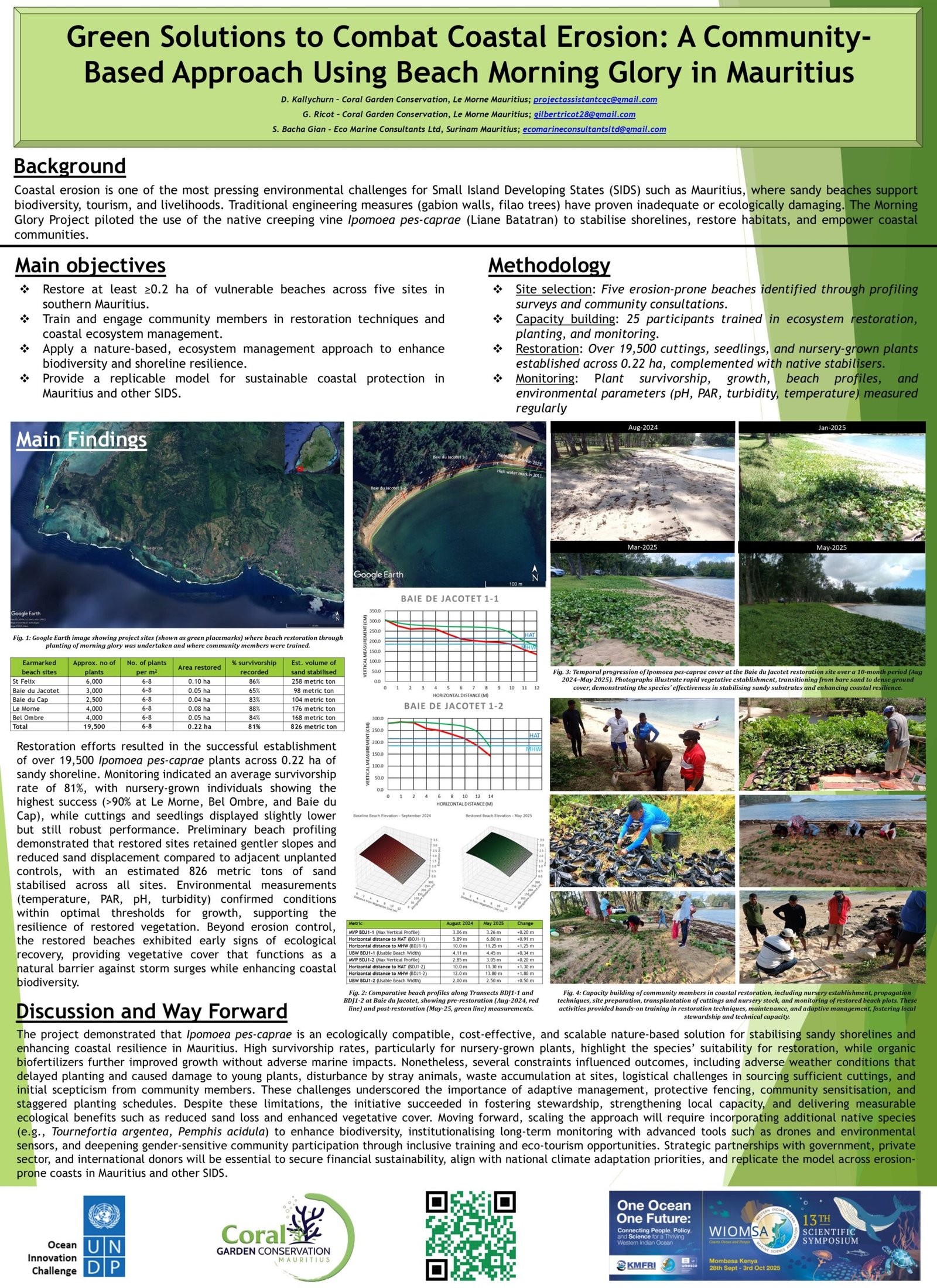 The Liane Batatran Project stands as a testament to the power of nature-based solutions in combating coastal erosion. By integrating ecological restoration with community participation, CGC has successfully developed a sustainable model for shoreline protection. The success of this initiative highlights the importance of leveraging indigenous plant species to reinforce coastal resilience while simultaneously providing economic and educational benefits to local populations. Moving forward, CGC will continue its bi-annual surveys in monitoring of plant survival, sand stabilisation, and biodiversity improvements in order to assess the long-term impact of Ipomoea pes-caprae as a coastal protection mechanism.