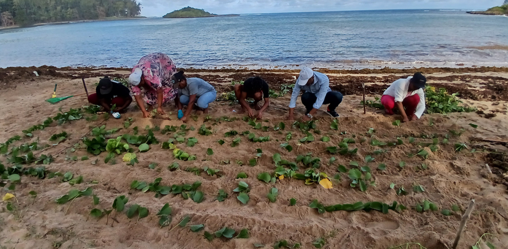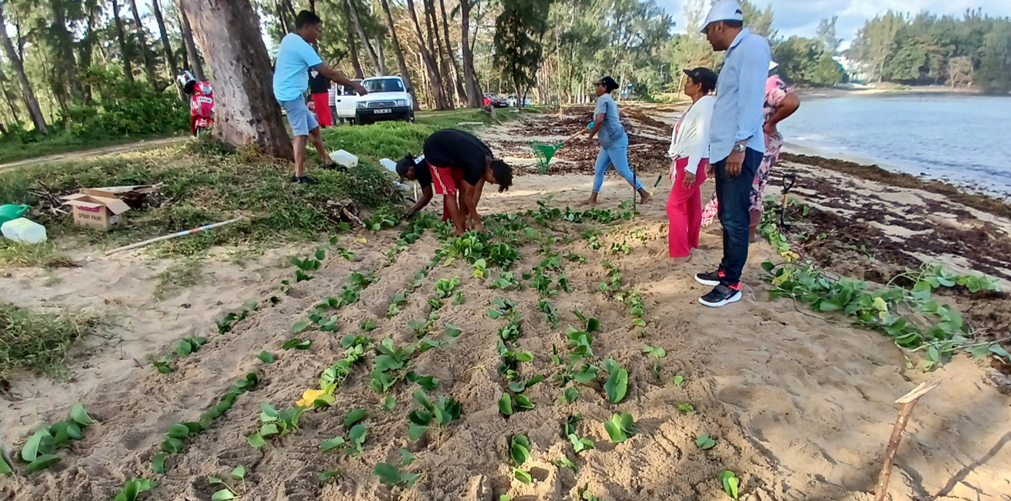 Coastal erosion is one of the most pressing environmental challenges facing Mauritius. With sandy beaches rapidly retreating due to climate change, human activities, and natural weather events, urgent action is needed to protect these fragile ecosystems. In response, CGC launched the Liane Batatran Project, an innovative nature-based solution aimed at restoring degraded beaches. By using Ipomoea pes-caprae, commonly known as Beach Morning Glory, CGC has successfully stabilised shorelines, enhanced biodiversity, and engaged local communities in sustainable coastal conservation efforts. The project, which was supported by the UNDP Ocean Innovation Challenge, with funding from Sida and Norad. focused on five critical sites—St. Felix, Baie du Cap, Baie du Jacotet, Le Morne, and Bel Ombre—where extensive environmental assessments were conducted to determine the best locations for restoration. A total of 19,000 Ipomoea pes-caprae plants including cuttings, seedlings and nursery-grown propagules were propagated and transplanted across 0.22 hectares of beach. The selection of this plant was strategic, as its extensive root system helps anchor sand, preventing erosion while supporting the natural dynamics of coastal ecosystems.